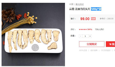 此款当归自上线以来,客户回购率相当高,500g*袋,仅需99元。客户反馈物美价廉,比实体药店买的要划算很多!点击进入产品页面